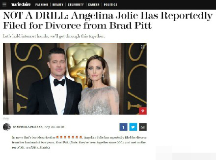 北京時間9月20日晚,據外媒報道,安吉麗娜在本周一正式提出離婚,理由是不可調和的分歧。倆人從2004年-2005年開始相戀,并于2014年8月結婚,不過才過了2個結婚紀念日就已經分手。根據文件顯示,倆人于9月15日正式分開。同樣指出,朱莉要獲得6個孩子的撫養權,而皮特有共同監護權,但只能接受探視。另外據TMZ稱,倆人就孩子的教育方式產生嚴重分歧,并導致離婚。