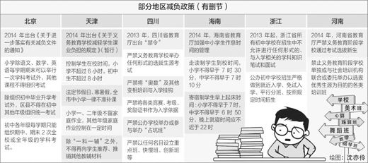 有的地區如河南,除了實施小學就近入學和取消小升初考試,同時還禁止義務教育階段學校單獨或與社會培訓機構聯合舉辦培訓班。有的地區選擇以減少平時考試次數為切入點。北京規定,小學除語文、數學、英語每學期期末可以舉行一次全;蛉昙墝W科考試外,其他課程不得組織考試。有的地區則對中小學生在校時間和課后作業有明確的規定,如天津要求小學生在校時間不得超過6小時,一、二年級不留家庭作業。