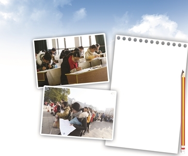 考生們進場前還要“抱下佛腳”,不過考題的知識點跨度很大。 新華報業視覺中心記者 邵丹 攝