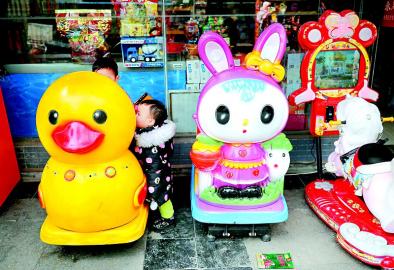 搖搖車的樂 放在商店前的搖搖車等街頭小型游樂設施,因乘坐價格便宜、造型卡通、色彩鮮艷,帶給低齡小朋友樂趣,受到不少小朋友的歡迎,圖為兩個小朋友搶坐一臺搖搖車。 本報記者 肖雨楊 攝