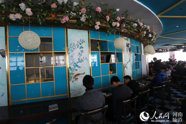2月26日,在河南鄭州華北水利水電大學,記者看到,學生們排隊在裝扮一新的學校食堂里就餐。曾經的硬座桌凳換成了軟座桌椅,屋頂以星空為主題背景,獨特的燈飾造型,十二星座圖案,山水、動物、人物繪畫,池塘里游來游去的金魚、蓮藕將環境布置的十分溫馨、雅致,炫美。