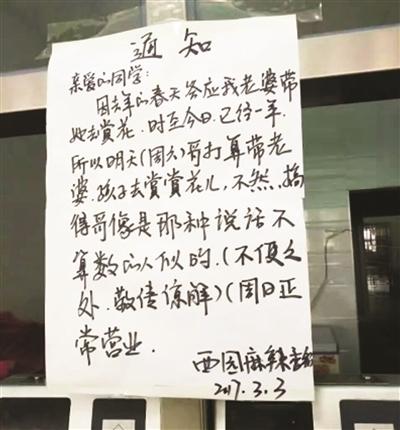 從前年中秋開始,武漢生物工程學院廚師侯高紅,先后貼出了4張停業通知單——“中秋相親停業一天”“相親失敗再相親停業兩天”“老婆臨產停業三天”“全家賞花停業一天”。看到這些另類通知的同學們不淡定了:這完全就是一條“人生贏家之路”嘛。據記者了解,這些“通知”也許還將繼續……