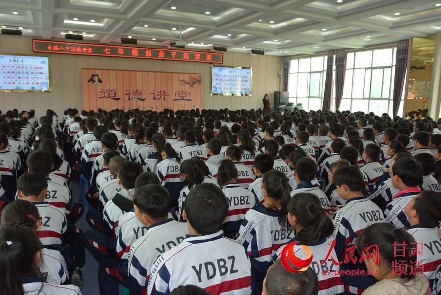 12日下午,永登八中七年級全體同學,齊聚教學樓5樓大教室,集體學習《弟子規》。在一名女老師的帶領下,數百名同學一起朗誦《弟子規》中的“親仁”一節:“……能親仁,無限好。德日進,過日少;不親仁,無限害。小人進,百事壞。”隨后,老師為大家進行了釋義講解。