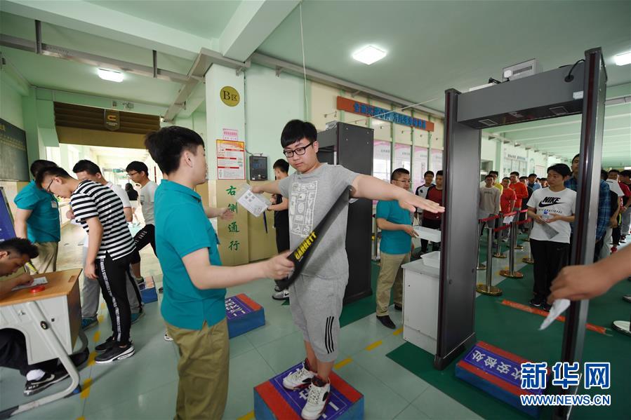 6月6日,在吉林長春第二實驗中學考點,工作人員對前來查看考場的考生進行安檢。當日,記者從教育部獲悉,2017年全國統一高考將于6月7日至8日進行,部分省(區、市)由于考試科目設置不同,9日仍安排有考試科目。今年全國高考報名考生共940萬人。新華社記者 張楠 攝 -