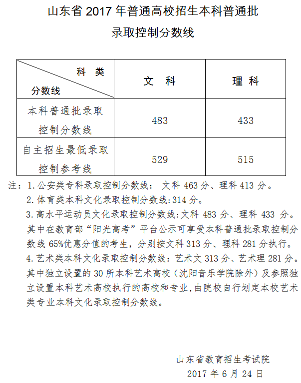2017年山東省高考各批次分數線公布,具體如下: