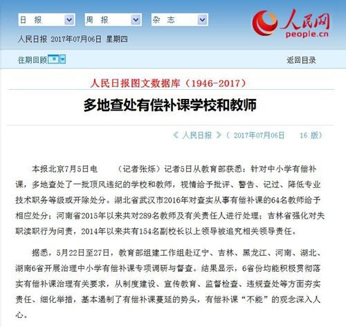 人民網(wǎng)北京7月10日電 (張政)近日,人民日?qǐng)?bào)記者從教育部獲悉:針對(duì)中小學(xué)有償補(bǔ)課,多地查處了一批頂風(fēng)違紀(jì)的學(xué)校和教師,視情況給予批評(píng)、警告、記過、降低專業(yè)技術(shù)職務(wù)等級(jí)或開除處分。湖北省武漢市2016年對(duì)查實(shí)從事有償補(bǔ)課的64名教師給予相應(yīng)處分;河南省2015年以來共對(duì)289名教師及有關(guān)責(zé)任人進(jìn)行處理;吉林省強(qiáng)化對(duì)失職瀆職行為問責(zé),2014年以來共有154名副校長(zhǎng)以上領(lǐng)導(dǎo)被追究相關(guān)領(lǐng)導(dǎo)責(zé)任。