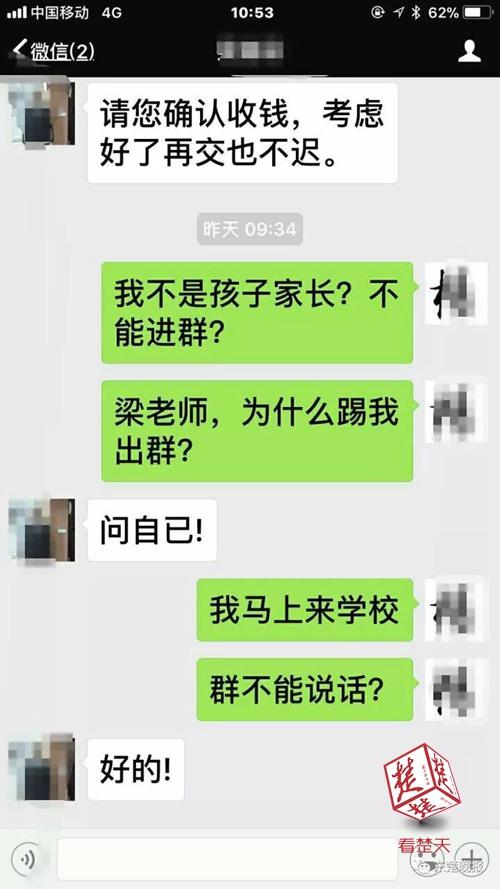 楚天都市報記者在楊先生提供的視頻中看到,他反映情況后,該校一負責人說去找梁老師了解一下情況。幾分鐘后,該負責人回來后問楊先生:“你還沒認識你錯在哪里?”楊先生問他:“你們踢我出群就是我錯了嗎?”“對!”該負責人說。 “家長群是不是什么人都能進?”楊先生反問。