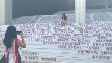 5月28日上午,記者來到成都理工大學香樟食堂,遠遠就看到門口階梯被滿滿的文字包著,甚是震撼。近看,這些文字都是表白學校、老師、同學的情話。有的直白樸實,有的含蓄文藝。