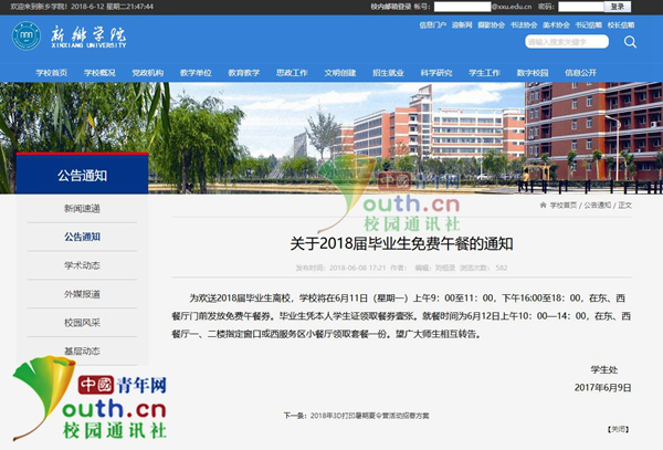 記者在該校官方網(wǎng)站看到,在公告通知一欄,該校學生處于6月9日發(fā)布了《關于2018屆畢業(yè)生免費午餐的通知》,通知內容為:為歡送2018屆畢業(yè)生離校,學校將在6月11日(星期一)上午9:00至11:00,下午16:00至18:00,在東、西餐廳門前發(fā)放免費午餐券。畢業(yè)生憑本人學生證領取餐券壹張。就餐時間為6月12日上午10:00—14:00,在東、西餐廳一、二樓指定窗口或西服務區(qū)小餐廳領取套餐一份。望廣大師生相互轉告。