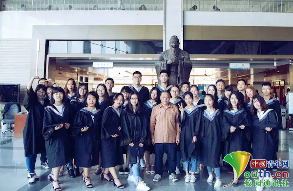 “張爺爺,我們和您一起拍張畢業(yè)照吧!碑厴I(yè)季,在中國石油大學(xué)(華東)圖書館,一隊隊身著學(xué)位服的畢業(yè)生簇擁著59歲的“書香守護人”張景海,在孔子像前幸福地拍合影。