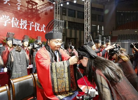 6月20日,江蘇一高校舉行研究生畢業典禮,典禮上校方領導和畢業生全部身著漢服,采取穿漢服、行漢禮、奏漢樂的形式。圖為畢業典禮現場。