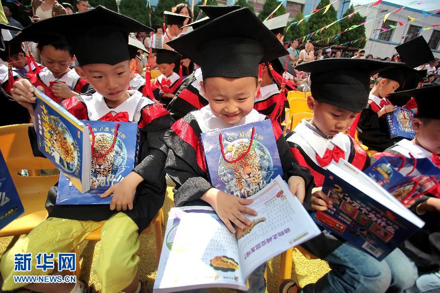 7月4日,甘肅省平涼市幼兒園的小朋友們在翻閱收到的畢業禮物——《十萬個為什么》圖書。當日,甘肅省平涼市幼兒園舉行2014屆大班小朋友畢業典禮,200多名小朋友結束幼兒園的生活,即將進入小學開始學習。孩子們身著迷你畢業服和帽子,在典禮上唱畢業歌,互換禮物。新華社發(楊昕 攝)