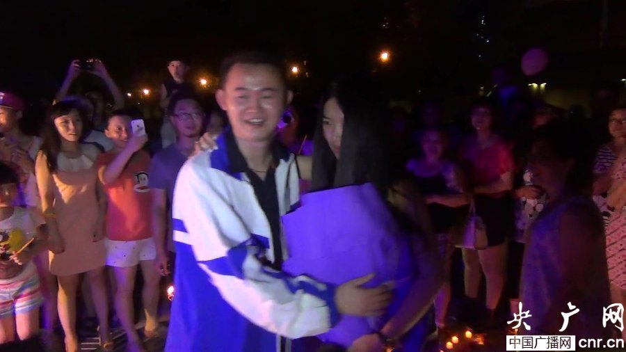 就在這時,伴隨著《做我老婆好不好》的音樂,身穿高中校服的男主角毛先生站在蠟燭圈中,單膝跪地,手捧99朵玫瑰,對女友李小姐說:“我今天向你求婚,天太熱了,我受不了了,你答應我吧!”與此同時,女友將手伸到毛先生面前,一枚戒指滑向指間,圍觀的親友及市民連連拍手叫好。正在廣場上散步的多位市民見證了這個求婚的全過程,不禁感嘆:“如今的年輕人還真浪漫啊。”