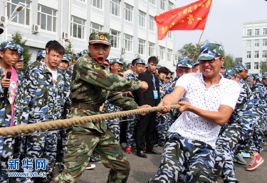 8月24日,在哈爾濱市信息工程學院,武警哈爾濱市森林支隊的教官帶領參加在軍訓的學生進行拔河比賽。日前,哈爾濱市部分學校新生開始軍訓。在哈爾濱市信息工程學院,學生們在武警哈爾濱市森林支隊教官的指導下,站軍姿、踢正步、敬軍禮,校園里到處都是綠色軍營的味道。新華社發(于宗明攝)