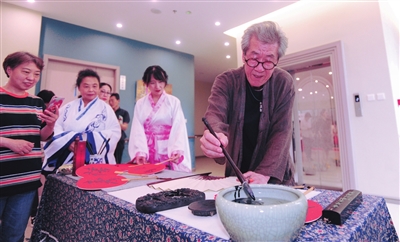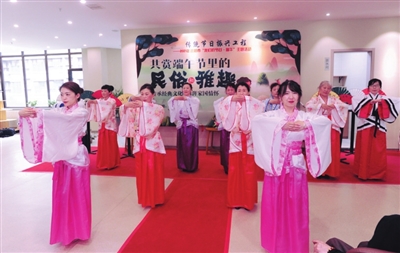 “粽香四溢飄蕩,扇面書法有長;姐妹演繹漢禮,描紅寫就詩章;答題接龍獲獎,節日歡聚一堂;企業搭臺唱戲,居家養老歡唱!”活動現場,一位阿姨自告奮勇地要向大家分享她即興創作的小詩,“今天能夠與大家歡聚一堂,一起過節,一起體味傳統文化,是一種難得的體驗和經歷。我們愿意與年輕人一起,為振興傳統文化、發揚優秀民俗貢獻一份自己的力量。”