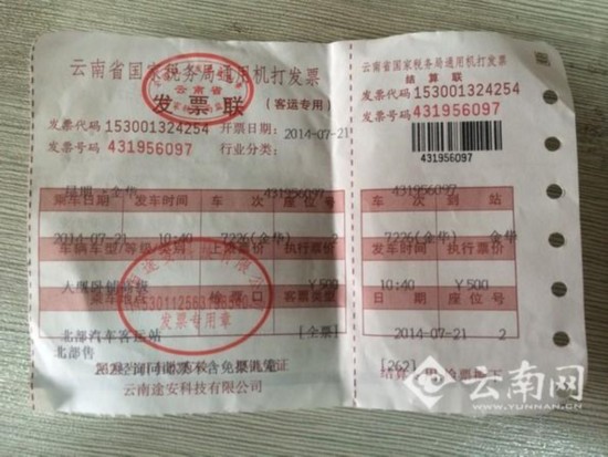 昆明北部汽車客運站副站長丁虎告訴記者:“不論是在客運站售票廳,還是在其他的車票代售處,昆明五個汽車客運站所用車票統一都是云南省國家稅務局通用機打發票,手寫車票絕對是假的!
