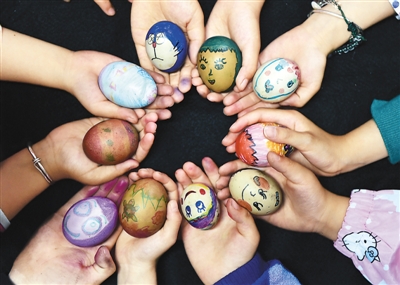 圖為今年5月5日立夏,安徽省合肥市香樟雅苑小學(xué)學(xué)生在展示自己手繪的彩蛋。