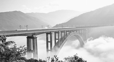 28日,一列動(dòng)車組正在穿越云霧繚繞的南盤江特大橋。
