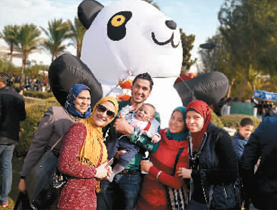 1月20日,在埃及首都開羅,人們在春節大廟會上合影留念。