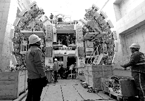 北京晨報(bào)記者在現(xiàn)場看到,各種吊車、大型作業(yè)機(jī)器正在緊張作業(yè)中。記者走到隧道“洞口”處看到, 腳下一臺巨型的盾構(gòu)機(jī)呈現(xiàn)在眼前,由于隧道采用明挖法、暗挖法、盾構(gòu)法相結(jié)合的施工作業(yè)方法,據(jù)記者目測,從盾構(gòu)機(jī)最底端到記者所在的地面約有七八層樓高。幾十名施工人員正冒著寒風(fēng)對盾構(gòu)機(jī)進(jìn)行組裝、吊裝。北京晨報(bào)記者了解到,這臺巨型盾構(gòu)機(jī)直徑達(dá)11米左右。