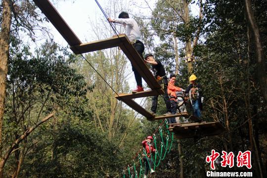 3月8日,游客正在體驗剛開放的飛越叢林樹上探險項目。經過兩年的建設籌備與試營運,長沙飛越叢林戶外冒險樂園將于3月15日在湖南長沙大明山莊正式開園。據了解,這是“飛越叢林”繼福州、重慶、成都之后中國第四家,也是華中地區首家叢林冒險樂園。