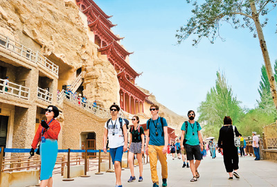 進入火熱的7月,敦煌旅游持續升溫。被譽為沙漠中美術館的世界文化遺產——敦煌莫高窟,游客超過了每日限額。圖為游客在敦煌莫高窟觀光游覽。