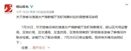 7月26日,針對游客反映的漁港水產海鮮餐廳龍蝦消費情況,嶗山區市場監管局、區物價局、區交通局、區食藥局、區商務局等部門積極聯系游客了解情況并聯合檢查。該餐廳為了配合調查,7月28日已停業整頓。有關情況說明如下: