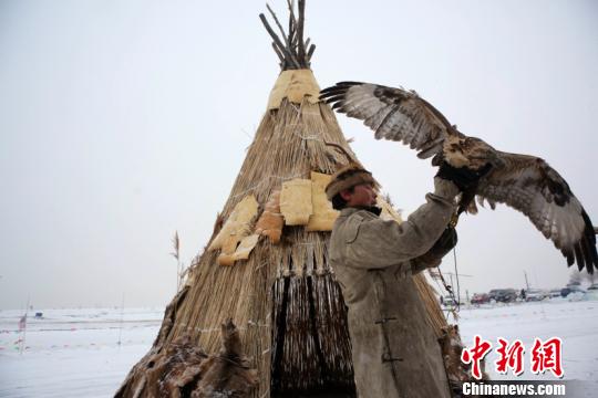 圖為冰釣節(jié)現(xiàn)場(chǎng)的達(dá)斡爾獵民和獵鷹 莫旗旅游局供圖