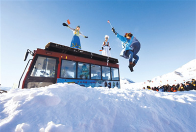 1月1日,在新疆喀納斯禾木村舉辦的潑雪節上,當地居民在為游客表演跳雪。