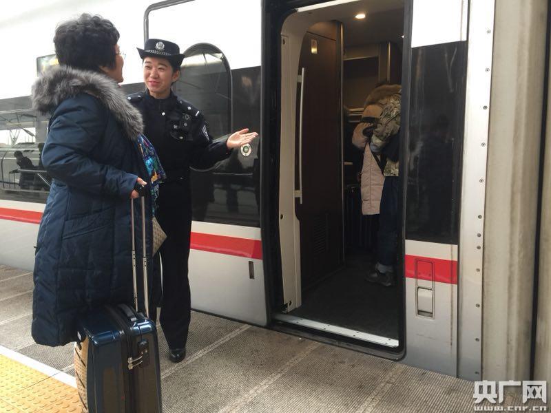 央廣網北京1月23日消息 “你好,受累看一下我是坐這趟車嗎?”“阿姨您好,您的車票上是G1次列車,小心站臺與列車的空隙,慢點上車……”2018年1月22日上午8時45分,由天津鐵路公安處乘警支隊擔當值乘的G1次列車上,即將迎來乘警生涯春運首秀的劉曉燕,有條不紊的組織旅客乘降,迎接旅客上車。