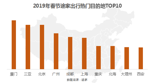 2019年春節期間,途家平臺TOP10國內熱門出行目的地依次為:廈門、三亞、北京、廣州、成都、上海、重慶、北海、大理州、西安。不難發現,除北京和西安外,其余均為南方城市。春季南方氣候溫暖舒適,適合游玩,尤其是廈門和三亞這樣氣候適宜的海邊城市,民宿房源豐富且發展比較完善,因此成為春節期間熱門目的地。