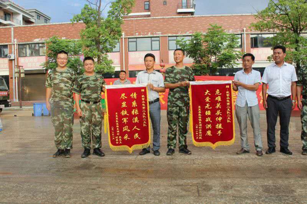 8月9日下午17時40分,在武警水電二支隊安徽東至縣搶險臨時營區(qū)門口,十幾名當(dāng)?shù)厥転?zāi)群眾拉起了“感謝人民子弟兵,期盼留下建家園”“家園重建需要您”等橫幅,送來了“情系張溪人民,盡顯鐵軍風(fēng)采”“危難關(guān)頭伸援手,大愛無疆戰(zhàn)洪魔”兩面錦旗,到部隊“請愿”,請求官兵們留下來,繼續(xù)幫助當(dāng)?shù)馗愫脼?zāi)后重建。