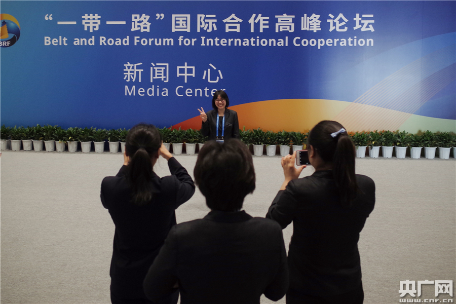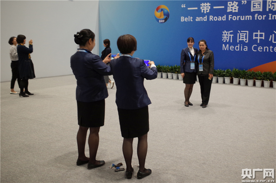 在“一帶一路”國際合作高峰論壇新聞中心內,工作人員們紛紛合影留念。(央廣網記者 王永康 攝) -