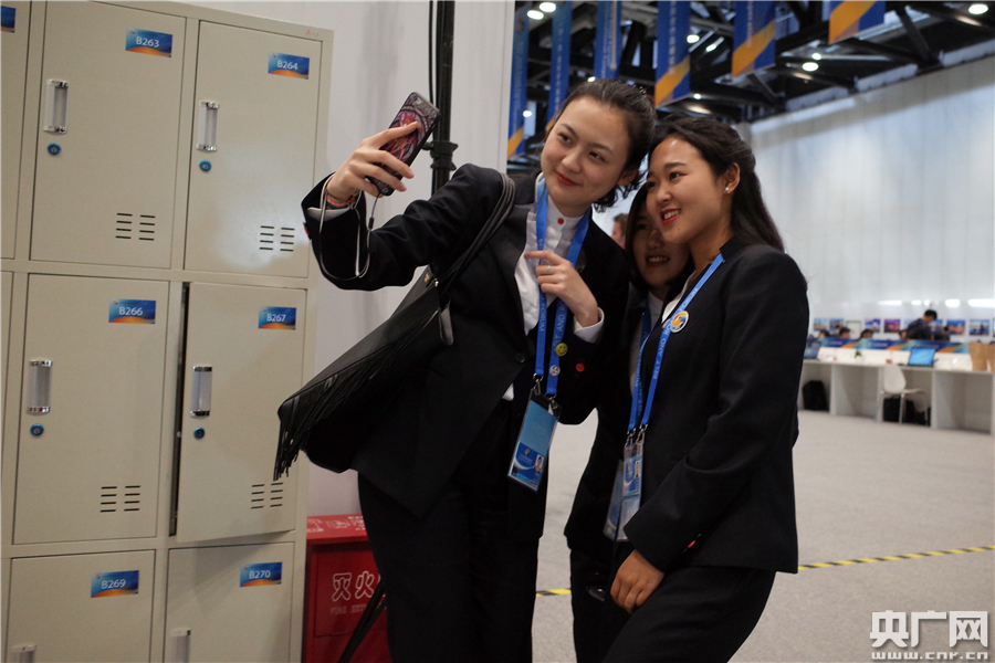 在“一帶一路”國際合作高峰論壇展廳內,兩名記者在拍照留念。(央廣網記者 王永康 攝) -