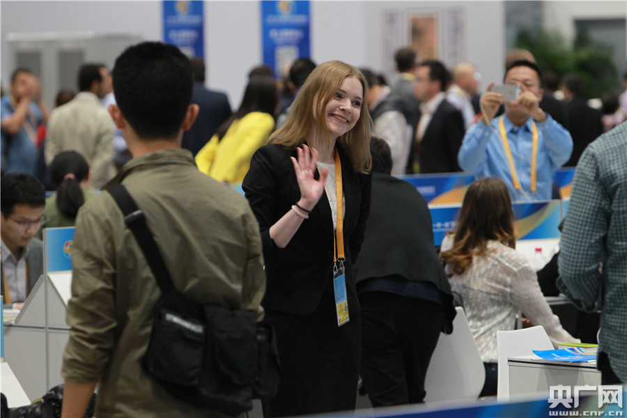 在“一帶一路”國際合作高峰論壇新聞中心內,一名記者揮手告別。(央廣網記者 韓靖 攝) -
