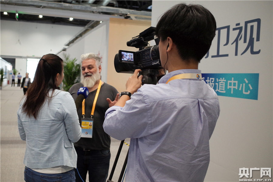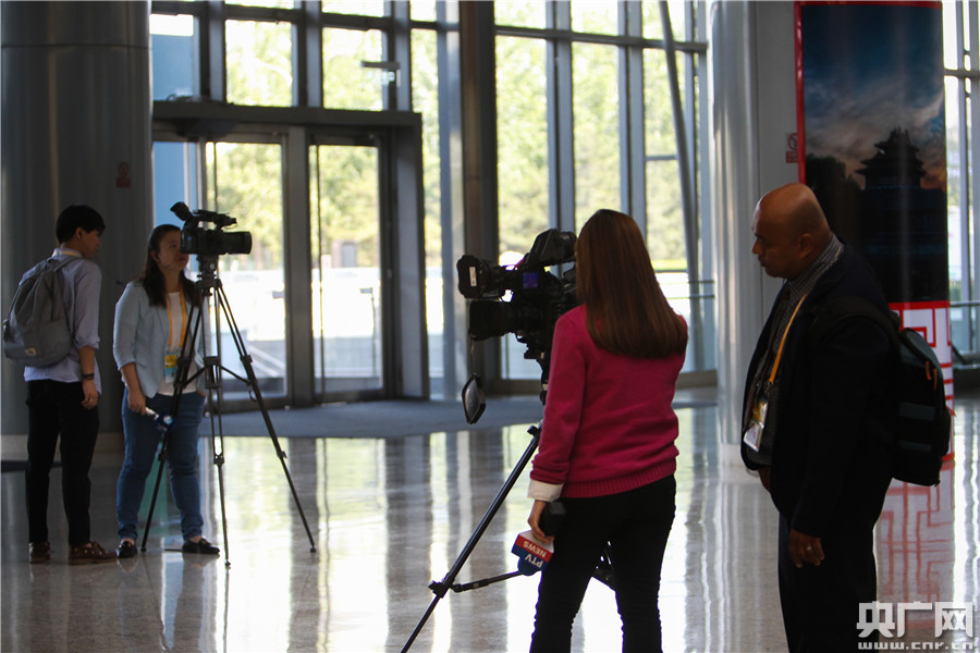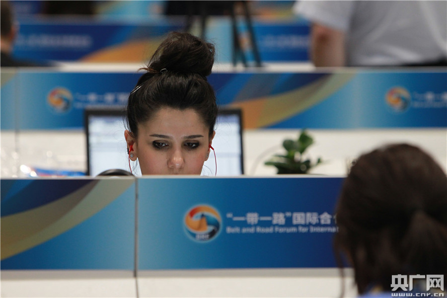 在“一帶一路”國際合作高峰論壇新聞中心內,記者在進行采訪。(央廣網記者 王永康 攝) -