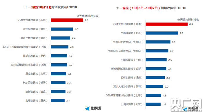其中,報告還預計10月1日0:00~1:00,較擁堵收費站主要集中于北京、上海、蘇州等地,其中北京占據了TOP 10最擁堵收費站的3席,排名前三的收費站分別為北京康莊收費站、蘇州蘇通大橋南收費站和昆明北收費站。