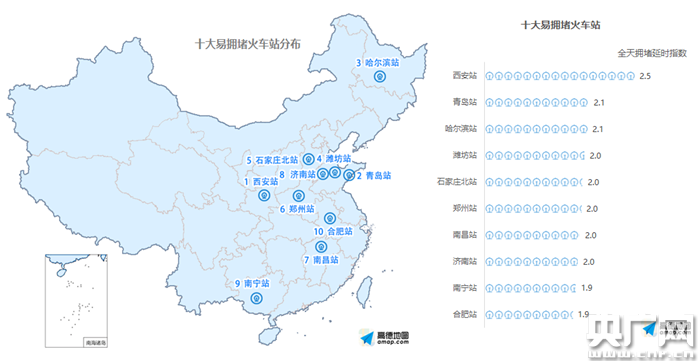 在火車站方面,從高德地圖交通大數據預測的全國主要火車站周邊道路擁堵數據分析看,十一長假期間,西安站、青島站、哈爾濱站周邊道路擁堵程度最高,其中西安站周邊在十一期間的擁堵延時指數達到了2.5,青島站和哈爾濱站也達到了2.1,出行所需花費的時間成本較大。