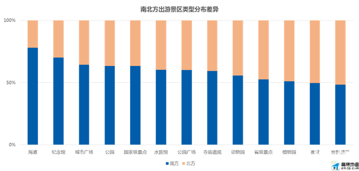此外,從南北方景區出游類型分布差異上看,十一黃金周期間預計南方的出游用戶比例將高于北方,其中受溫度影響,海灘游南方將明顯高于北方,而在世界遺產、教堂類景區的出游占比上,北方則偏高于南方。