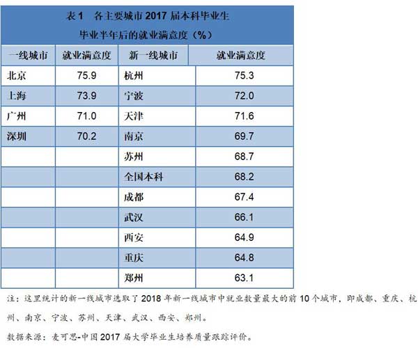 記者還注意到,近五屆大學(xué)畢業(yè)生就業(yè)滿意度持續(xù)上升,共上升11個(gè)百分點(diǎn)。從不同城市來看,北京是“北上廣深”四個(gè)一線城市中就業(yè)滿意度最高城市,杭州是新一線城市中就業(yè)滿意度最高城市。