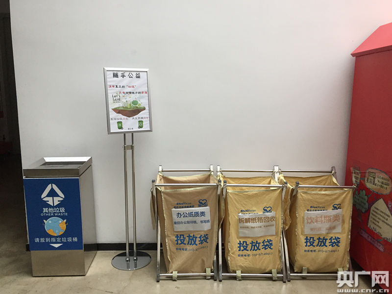 記者在藍(lán)色光標(biāo)參觀時發(fā)現(xiàn),在大樓進(jìn)出口、電梯口、辦公區(qū)和人群聚集區(qū)域內(nèi),均設(shè)置了不同門類的垃圾投放袋,主要包括白色辦公廢紙類、報紙類、雜志書本類、箱板類、飲料瓶類等。員工也都自覺把垃圾按門類分裝包好才扔進(jìn)不同的垃圾箱內(nèi)。