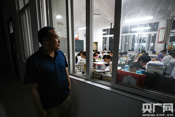 河南省舞鋼市第一高級中學,師生積極備考,圖為一名老師在教室外關注學生自習情況。(央廣網記者 張凱航 攝)