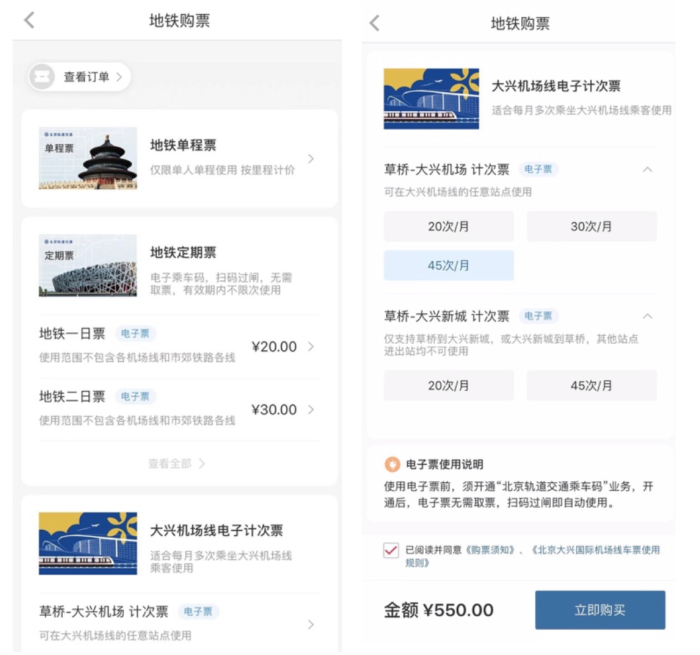 電子計次票主要包括:草橋站至大興機場站區段,45次票550元、30次票470元、20次票385元三種;草橋站至大興新城站區段,45次票360元、20次票180元兩種。乘客可結合自身出行的區間及次數需求,選擇購買相應的區間、次數的電子計次票。
