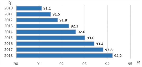 2010—2018年九年義務(wù)教育鞏固率情況(央廣網(wǎng)發(fā) 國家統(tǒng)計局供圖)