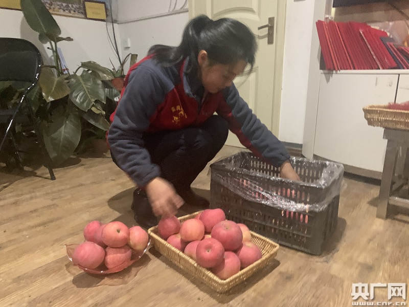 1月20日,牛慶花正在自家倉(cāng)庫(kù)中打包要發(fā)貨的蘋果(央廣網(wǎng)記者孫冰潔 攝)
