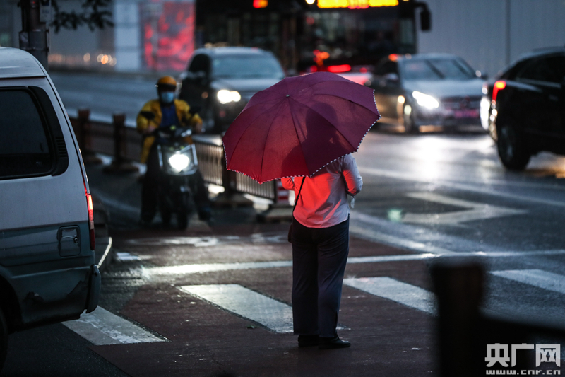 8月12日,北京國貿,一名行人在雨中等待過馬路(央廣網記者 韓靖 攝)