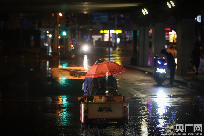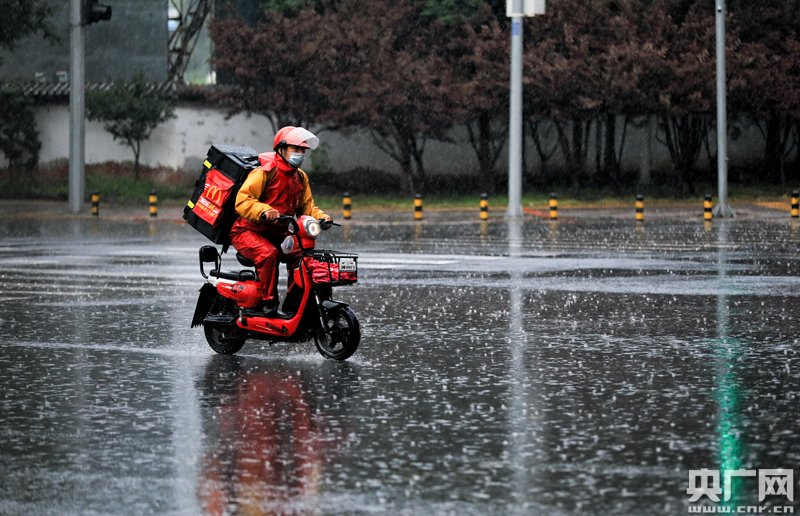 8月12日,北京房山長陽,在雨中穿行的“外賣小哥”(央廣網記者 石昊鑫 攝)
