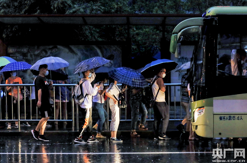 8月12日,北京十里河,行人打傘在雨中穿行(央廣網記者 韓靖 攝)