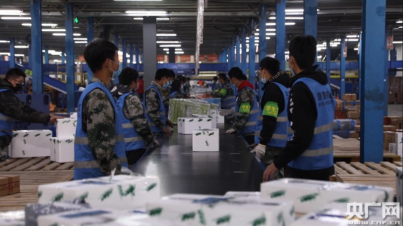 11月11日,蘇寧通州物流基地一片繁忙景象(央廣網記者 王晶 攝)