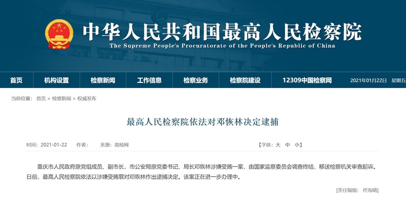 央廣網北京1月22日消息(記者張瀟祎)記者從最高人民檢察院網站獲悉,重慶市人民政府原黨組成員、副市長,市公安局原黨委書記、局長鄧恢林涉嫌受賄一案,由國家監察委員會調查終結,移送檢察機關審查起訴。日前,最高人民檢察院依法以涉嫌受賄罪對鄧恢林作出逮捕決定。該案正在進一步辦理中。